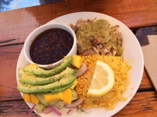 Black beans, yellow rice, pork shoulder, avocado, mango, red onion, green tomatillo sauce