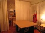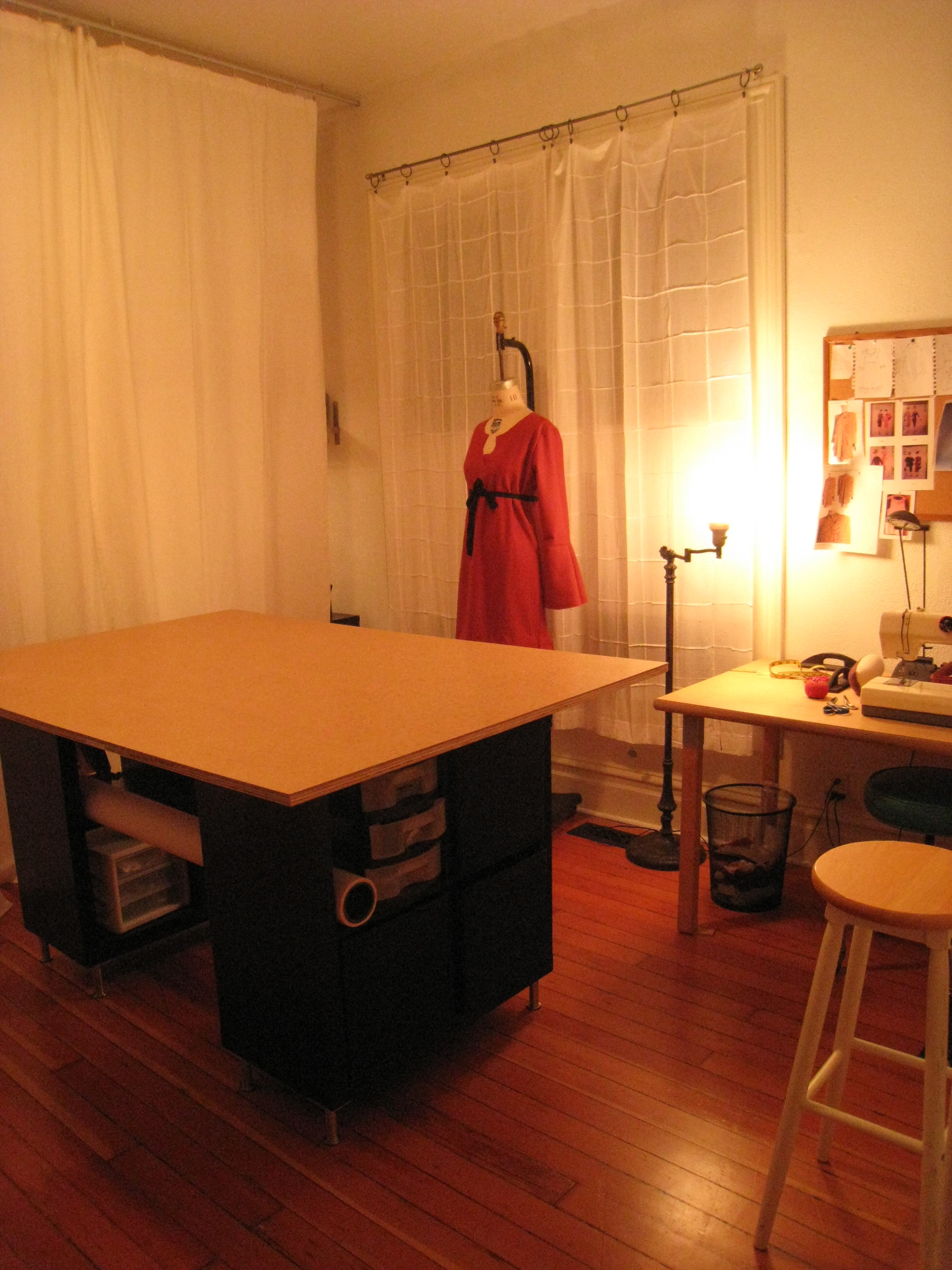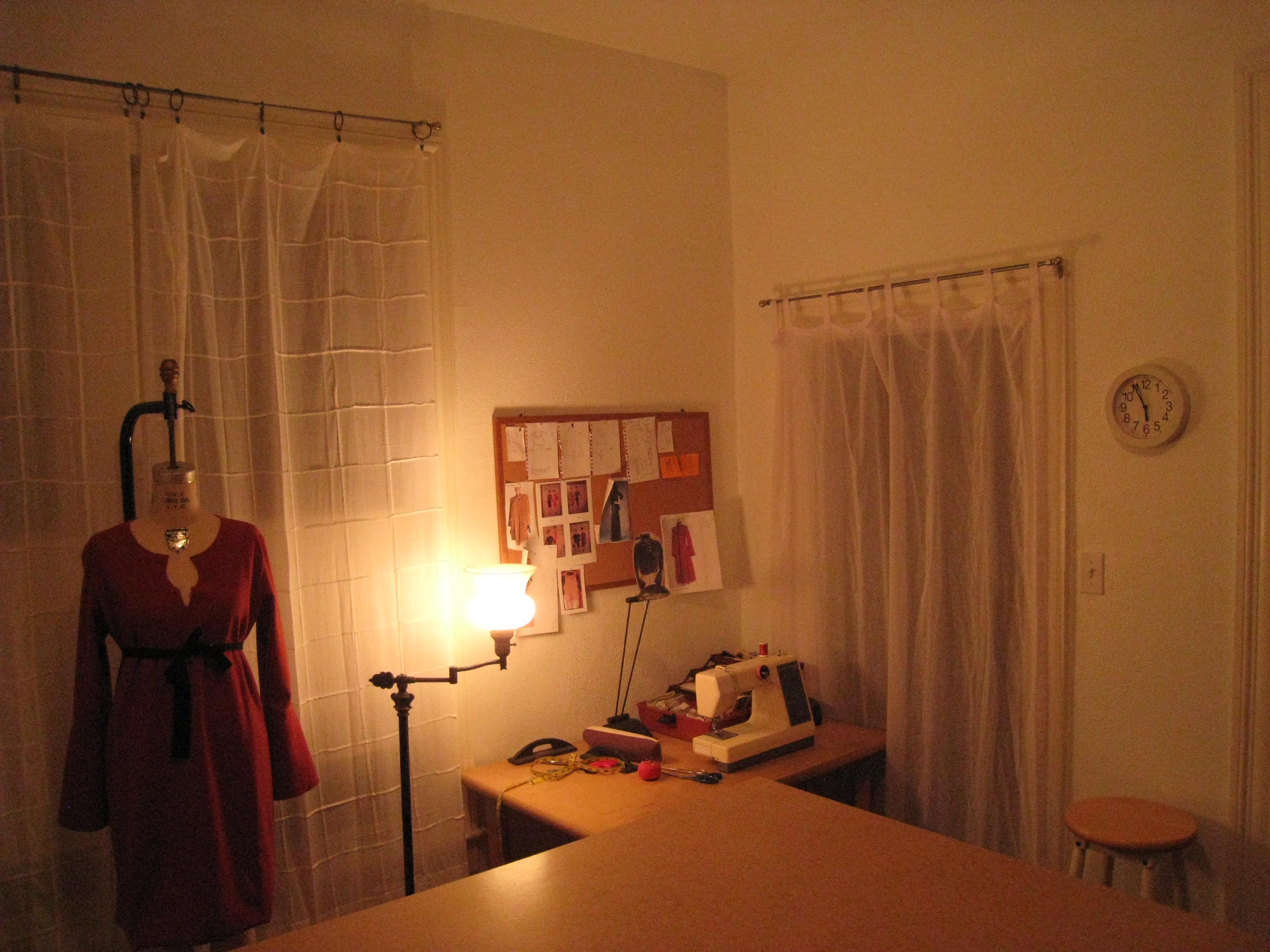 We have a dining room that serves us well but mind you it is hardly ever used, as we prefer to sit in front of the televison and eat sloppily, I hate to say it.  It is great for guests and parties but otherwise not too useful.  I was thinking of converting it into my design studio but John did not like the idea too much.  Amidst great resistance and fear of retribution from him I decided to do it anyway, sneakily while he was at work.  I even had a friend come and help me install the IKEA ceiling curtain rods, which took all day , by the way.  I also got the drapes from IKEA and cut off the tabs and hemmed the bottom.  These were extra long, whick I needed for our 10 foot ceilings.