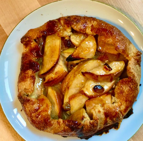 When winter sets in, make this smallish apple gallette!!!!!! One large apple is all you need, apple juice reduced, homemade pie dough apricot jam glaze!