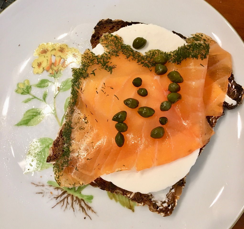 Sliced rye bread, slightly toasted, spread with cream cheese, three slices of farm cheese and a sheet of smoked salmon! Top with a sprkinkle of capers and some pepper!